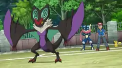 In A Full-Strength Battle Surprise!, Noivern was Ash's first Pokémon used in his three-on-three battle against Sawyer, where he faced Sawyer's Doublade. At first, he constantly attacked with Acrobatics, but Doublade shielded itself with Iron Defense, wearing Noivern out. After they repeatedly clashed this way, Doublade knocked down Noivern with its Slash and attempted to finish Noivern off using Night Slash. Noivern, however, used the dust from the battlefield to dodge Doublade's attack and used echolocation to spot Doublade in the dust cloud. He then proceeded to knock Doublade into the air with his newly revealed Dragon Claw, and finished his opponent off with Acrobatics, netting him his first official win. He then fought Sawyer's Clawitzer, dodging an incoming Crabhammer and knocking Clawitzer down with Boomburst. After Clawitzer recovered with Heal Pulse, Noivern attacked with Dragon Claw, but fell to a Mega Launcher-boosted super-effective Dragon Pulse.