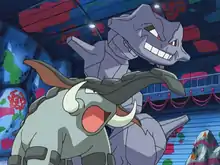 In Grating Spaces!, Ash used Donphan in a Double Battle with Brock and his Steelix against Jessie, James, and their newly obtained Charizard and Aggron. The two Pokémon worked well together, with Donphan rescuing Steelix from Charizard's Flamethrower by attacking Charizard recklessly. However, Aggron fought back with Mega Punch and Hyper Beam, knocking Donphan back. Donphan recovered and kept attacking Charizard, but Aggron's Water Pulse took it down. Steelix propelled Donphan over the subsequent wave of water and allowed it to hit Aggron. At this point, the battle ended when Forrest confronted Team Rocket's objectives.