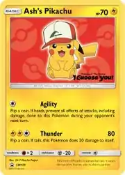 Ash's Pikachu (Japanese: サトシのピカチュウ Satoshi's Pikachu) is a Lightning-type Basic Pokémon card. It is one of the SM Black Star Promos.