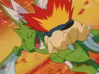 In Gettin' The Bugs Out!, Ash used Cyndaquil as his first Pokémon in his Azalea Gym battle, going up against Bugsy's Spinarak. Although Misty thought Cyndaquil was a good choice, it was tired and its flame wasn't ignited. After using its agility to dodge Spinarak's String Shot, Bugsy had Spinarak used String Shot on the whole field, getting Cyndaquil's feet stuck. Ash tried to get Cyndaquil to use Flamethrower, but it didn't work, with Ash noticing that it must take time for Cyndaquil to warm up. Spinarak then hit Cyndaquil with Poison Sting, and just as it was about to hit Cyndaquil with another one, Ash recalled Cyndaquil back and chose Chikorita. Later it went up against Bugsy's last and most powerful Pokémon, his Scyther. Cyndaquil was still unable to light its flame, and Scyther used Fury Cutter, which was easily dodged by its agility. Scyther then used Double Team, and Cyndaquil finally launched its Flamethrower, destroying all the clones. Despite this the real Scyther used Swords Dance like a fan to block the flames before using Slash. After realizing normal attacks wouldn't work, Ash came up with an idea; he waited for Scyther to again use Sword Dance before having Cyndaquil jump and use Flamethrower directly on Scyther. The combination turned into a deadly inferno that engulfed Scyther and Cyndaquil then finished things off with Tackle, winning Ash the battle and earning him the Hive Badge.