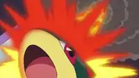 Ash called Cyndaquil back into his party for the Lily of the Valley Conference in An Old Family Blend!. It was separated from Ash along with Snorlax, Bayleef, Totodile, and Corphish when Team Rocket attempted to steal them. While trying to find and reunite with Ash, Cyndaquil was attacked by one of Team Rocket's mechas. In the battle against Team Rocket, Cyndaquil demonstrated that it had learned the move Flame Wheel during its time at Oak's lab. Despite its new attack, Cyndaquil was having trouble defeating the robot. Cyndaquil then evolved into Quilava and used its new Eruption attack to destroy their mecha.
