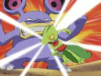 In Odd Pokémon Out!, it developed a crush on a Meganium owned by the Nurse Joy from Camomile Island and evolved into a Sceptile to rescue it when it had fallen into Team Rocket's hands. However, the Meganium was attracted to a Tropius, leaving Sceptile heartbroken and unable to use any moves. It regained its ability to use attacks in Cutting The Ties That Bind! to save Ash from Team Rocket with the use of Leaf Blade. It then used Quick Attack to save him and Bullet Seed to soften the fall. It was used in Ash's battle against Spenser in the following episode, Ka Boom with a View!, where it battled and defeated Shiftry and Claydol, giving Ash the Spirit Symbol after learning a new move, Solar Beam.