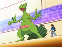 In Exploud and Clear!, while the other Pokémon ate food, Treecko didn't eat and acted distant, hiding up a tree and ignoring attempts by Ash and Corphish to be friendly. This worried Max but Ash assumed that it was just in a bad mood. All of a sudden a Loudred started rampaging through the area, which caught Treecko's interest. The Loudred's rampage was stopped by its Trainer Guy. Guy mentioned his Loudred had been acting weird lately, which Ash compared to his Treecko. Ash decided to battle Guy and his Loudred as he thought exercise could solve its problems and Treecko volunteered itself to battle. After battling hard both Pokémon evolved at the same time, Loudred into Exploud and Treecko into Grovyle. Grovyle demonstrated its new Leaf Blade attack, putting a twig in its mouth. Ash and Guy decided to continue the battle, but Exploud ignored its Trainer's commands, rampaging off. The two then followed Exploud. While looking for Exploud, Grovyle refused to return to its Poké Ball and went to higher ground, which caused May to comment that Grovyle was more stubborn after evolving. After Team Rocket angered Exploud, Grovyle heard Exploud and followed it to a waterfall, battling it again. Ash and the others eventually caught up with Grovyle and Exploud with Ash and Guy deciding to pick up the battle, with Exploud ignoring Guy's commands again. Team Rocket then tried to capture Exploud again, but Guy was able to protect it, earning its respect. With Exploud obeying Guy again, Ash decided to finish the battle using Grovyle again. The outcome of the battle was unknown.