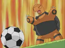 In the next episode, Ash introduced Torkoal to the rest of the group's Pokémon, which it greeted by releasing smoke from its nostrils. At a game carnival thrown by Team Rocket, Torkoal attempted to go on its back legs to kick a soccer ball, but ended up falling flat on its back. It was captured by Team Rocket along with Treecko and Corphish, but rescued by the intervention of Watt, Wattson, and Electrike. After Electrike evolved into Manectric, Torkoal was so happy that it engulfed them all in smoke. Ash and Wattson then decided to have an informal rematch, and Ash decided to put Torkoal up against the newly evolved Manectric. Torkoal was shown quickly to be very good defensively, using Iron Defense to avoid damage from Manectric's Bite, and its shell was tough enough to absorb Tackle without taking damage. Torkoal pushed back with an Overheat, the powerful attack blasting through Manectric's Thunder Wave and scoring a direct hit. Manectric then began to use Charge and held firm even against two more Overheats and a Flamethrower. Manectric let loose a devastating Thunder Wave, which Torkoal couldn't counter as its power had been drained from successive Overheats. Thunder Wave hit and knocked out Torkoal in a single hit.