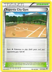 Aspertia City Gym (Japanese: ヒオウギシティジム Hiougi City Gym) is a Stadium card. It is part of the Boundaries Crossed expansion.