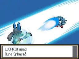 Lucario forms a light blue ball of energy in front of its hands and fires it at the opponent. | ||