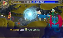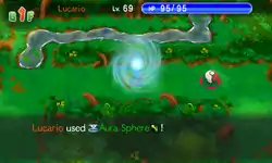 In Explorers of Time, Darkness and Sky, Aura Sphere is a move with 16 base power and 10 PP that ignores accuracy and evasion checks. The attack travels up to 10 tiles away and hits the first Pokémon it encounters, ally or enemy.