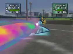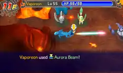 Vaporeon releases a multicolored beam from its mouth at the opponent, or Vaporeon creates a glowing bluish green orb and launches a glowing green and black beam towards the opponent. | ||