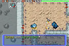 In Red Rescue Team and Blue Rescue Team, Aurora Beam has 10 base power, 17PP and 65% accuracy. The attack travels up to 10 tiles away and hits the first Pokémon it encounters, ally or enemy, possibly cutting its Attack stat to ½ of the original value. This reduction is separate from the stat stages, and is only shared with Charm and Memento.