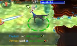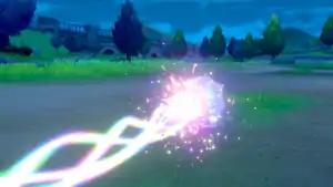 Xerneas creates two glowing rings around its horns, and launches a glowing blue and pink beam towards the opponent. | ||