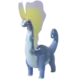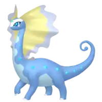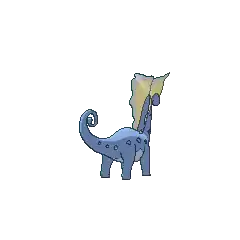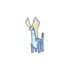 Aurorus is a quadrupedal, dinosaurian Pokémon that resembles a sauropod. It is primarily blue with a light blue underside. It has bright blue eyes, a long neck, and a long, tapering tail with a teardrop-shaped tip. On its head is a V-shaped white marking with a single, light blue crystal in the center. Two large, flowing sails extend from the top of its head and run down the length of its neck. The sails are pale whitish-yellow at the base and fade into a pale bluish-purple at the edges. However, its sails can change color depending on its mood as seen in Pokémon-Amie. Running the length of its body on either side is a line of small ice crystals. There are three clawed toes on its hind legs, but one large nail and a single claw on its forelegs.