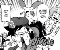 - In Hareta's Very First Pokémon Battle!!, he had his butt bitten by Hareta while battling in a cave.