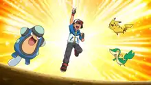 Ash is down to his last Pokémon, but doesn't know who to send out, stating that he has no Pokémon with an advantage over Electric and Flying-types. The referee tells him if he doesn't choose soon, he'll have to forfeit. Ash desperately tries to think of who would be most suited to battle Emolga. Pikachu unleashes a Thunderbolt on Ash, being so fed up that he hasn't considered using him. Ash realizes rather than relying on strategy, he needs to rely on the bonds and tenacity of his Pokémon. Ash asks Pikachu to fight, which Pikachu happily accepts. Pikachu starts off with an Electro Ball, but Emolga counters with her own Electro Ball, causing both Electro Balls to cancel each other out. Pikachu uses Quick Attack and sends Emolga into the wall, knocking her out.