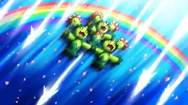 En route to the Driftveil Gym, Ash and friends come across a trio of Maractus and their Trainer, Toby, who are rehearsing for their upcoming audition at the Pokémon Musical in Nimbasa City. As part of their rehearsal, they plan to enter the Pokémon Performance Competition, but they’re having some trouble with their grand finale, a move called “Over the Rainbow” that involves one of the Maractus (named Tussy) leaping into the air and landing on the arms of the other two.
