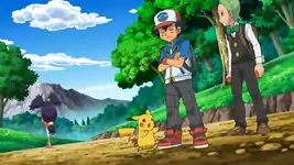 Awkwardly, Iris and Ash face each other, and after a gentle nudge by Cilan both of them profusely apologize. Pikachu finds some flowers while Axew picks some fruit, which they pass to their Trainers to exchange as peace offerings. Ash is amazed at how delicious the fruit is, while Iris is happy with the new flowers in her hair, and both of them make up. Cilan and Pikachu happily conclude that the friendship between Ash and Iris has been restored.