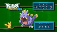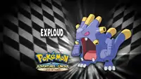 Before Axew and Emolga can escape, Meowth traps them inside a cage. With a few buttons on a remote, and a cage opens up and the Exploud from earlier is revealed. It lashes Emolga and Axew first with Thunder Punch and then with Flamethrower. Iris is extremely concerned for her Pokémon, but her Dragonite’s attacks don't do any damage to the cage. Back inside the cage, Exploud uses Thunder Punch on Axew, but Emolga steps in front and she takes the blow for Axew. Ash commands Charizard to use Wing Attack on the cage, but the attack fails and Charizard is pushed back as well. Frightfully, Exploud drops Axew into its jaws. Emolga launches a Hidden Power at her opponent, though it is Axew's Dragon Rage from inside Exploud that releases him. Iris and Emolga both let out sighs of relief and then Ash states he and Snivy need to help Pikachu. Not letting this happen, Jessie and James order their Pokémon to attack with Air Slash and Shadow Ball, but Snivy evades and strikes them down with a series of Vine Whips. A forcible Leaf Storm pushes them back, allowing Snivy to free Pikachu from the net with Leaf Blade. However, Jessie reminds them they still have Exploud to contend with. Exploud fires off several Hyper Beams in the cage, while Dragonite uses Dragon Rush which finally frees Axew and Emolga. The Exploud also escapes by using Thunder Punch to break out and continues to pursue Axew and Emolga in a rage. Ash commands Charizard to use Dragon Tail, and Iris commands Dragonite to use Dragon Rush. Both attacks are direct hit and the Exploud is pushed back so hard that it pops Team Rocket's balloon. As Team Rocket blasts off, Exploud is sent flying as well and uses a Thunder Punch to knock the trio away.