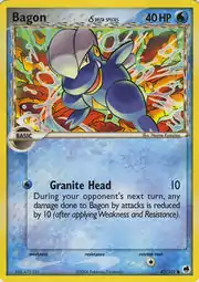 Bagon δ (Japanese: タツベイ δ Tatsubay δ) is a Water-type Basic Pokémon card. It is part of the EX Dragon Frontiers expansion.