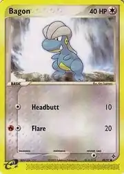 Bagon (Japanese: タツベイ Tatsubay) is a Colorless-type Basic Pokémon card. It was first released as part of the EX Dragon expansion.