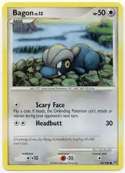 Bagon (Japanese: タツベイ Tatsubay) is a Colorless-type Basic Pokémon card. It is part of the Stormfront expansion.