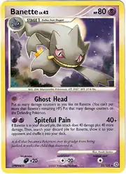 This card later received an erratum to change the Ghost Head attack to require that Banette cannot be Knocked Out, rather than simply prevent more damage counters than Banette's remaining HP to be placed (allowing Ghost Head to place damage counters to precisely Knock Out Banette prior to the erratum).