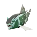 Basculegion is a large, green fish-like Pokémon. It has a jagged mouth with pointed teeth. Its spine is aligned with a dark grey line, with a colored line along it and extending around its gills, in addition to having spots along its torso and plumes of smoke around its tail - in male Basculegion they are red, while female Basculegion have pale blue accents. Their eyes also match the appropriate color, looking fierce on males and drowsy or sad on females. It has a pair of white pectoral fins, a three-spiked dorsal fin, and a two-spiked ventral fin. Additional smoke covers its face in a manner resembling barbels; female Basculegion sporting shorter ones and lacking the two small fins that the males have on their chin in exchange for more blue markings around the lips and eyes.