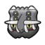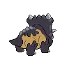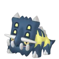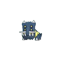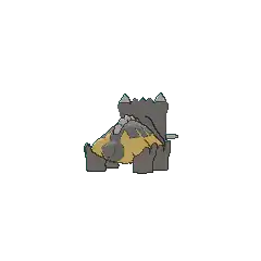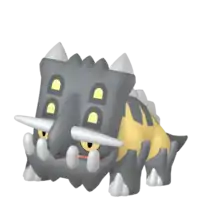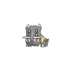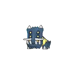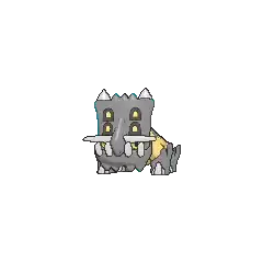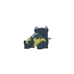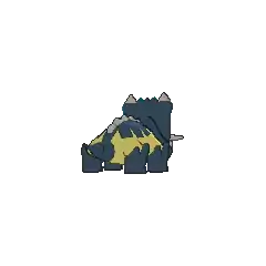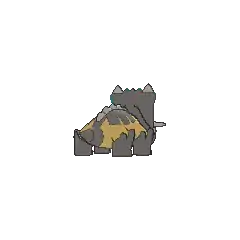 It is from roughly 100 million years ago. Despite its rough, intimidating appearance, Bastiodon is a docile, caring Pokémon that feeds on grass and Berries. Its steel-hard, shield-like face is capable of repelling any attack. When multiple Bastiodon line up, their faces form a wall that nothing can break through; this was how they protected their young. In stark contrast to its impenetrable frontal defense, it is vulnerable from behind. It seems to have lived in the same habitats as Rampardos, as evidenced by their fossils often being found together.