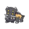 Bastiodon is a Pokémon which appears to be a cross between a ceratopsian such as Zuniceratops and a bulldozer. Its dark gray, square head resembles a castle wall, complete with four cream-yellow, window-like spots with a black outline, three dark gray spikes on the top, and two larger gray spikes in the upper corners. Bastiodon's triangular nose extends from the middle of its shield-like head down over its lips and appears to be pierced by a gray, horizontal spike. Four spikes jut downward and four large, blunt tusks protrude upward from its dark gray lower jaw. Bastiodon's cream-yellow eyes are partially obscured by the nasal spike and spaced-out tusks. Its thick, cream-yellow body is further protected by a gray ridge and dark gray plates on its back, jagged growths on its legs, and a plated tail.