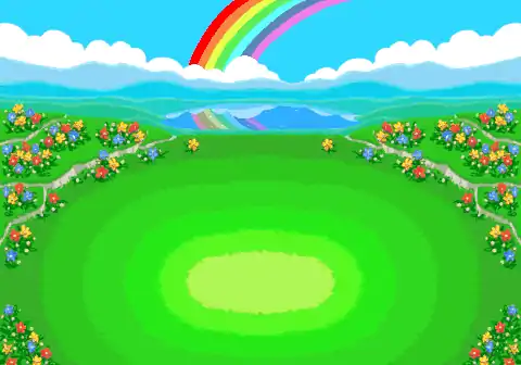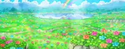 Beau Plains is a seemingly peaceful grassy meadow. The grounds are hilly and mainly lead into a lake, sparkling blue. Red, yellow and blue flowers surround a patch of bright green grass where the player's befriended Pokémon can be found. Sunshowers are common on Beau Plains with clouds looming over and its trademark rainbow in the distance.