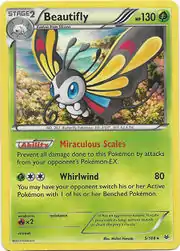 Miraculous Scales's Japanese name is a Miraculous form of Shield Dust, an Ability in the Pokémon games that Beautifly cannot have. Whirlwind is a move in the Pokémon games that Beautifly can learn. This card's Pokédex entry comes from Pokémon Y.