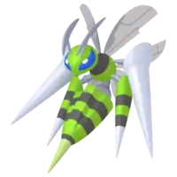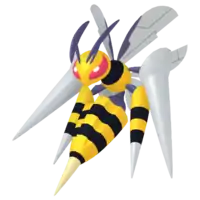 As Mega Beedrill, it gains more defined features. The antennae are shorter and T-shaped. Its eyes become longer and sleeker. It now has three pairs of wings; the uppermost pair is larger with a black trim along the top. Its stingers become longer and larger, resembling lances. Additional conical, black-and-yellow stingers with white tips take the place of its legs. Its abdomen becomes larger, grooved and is attached to its thorax by a black structure. A similar black structure connects its head and thorax. The stinger on its abdomen is now a pale yellow, and it now has black stripes over its entire body. Fast-acting poison is stored in the stingers on its limbs, while the tail stinger produces a slow-acting poison that is used to finish opponents. The instantaneous poisons are instead used to prevent the foe from fleeing.[1]