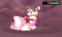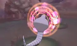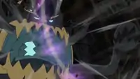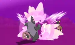 After eating something, Guzzlord releases purple rings of energy from its mouth at the opponent, followed by a wave of purple energy. Sometimes, the inside of Guzzlord's mouth glows white while using the move. | ||
