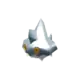 Bergmite is a quadrupedal Pokémon with a white, round body and nubby legs. Its upper half is encased in a slightly transparent, pale blue chunk of ice. Its eyes, which are yellow with purple sclerae, are visible through the ice. The ice itself forms a large triangle with smaller spikes on its forehead and hind end.