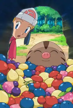 Additionally, some Berries have been shown to grow on a Pokémon's body. In The Lonely Snover!, a wild Snover gave Ash, Dawn, Brock, and their Pokémon some of the Berries growing around its belly. In the same episode, Ash's Grotle was shown to grow Berries on the trees on its back. Both of these Berries had no strange effects when consumed by humans or Pokémon.