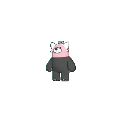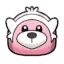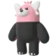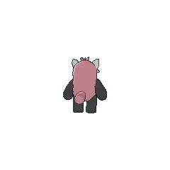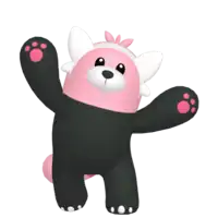 Bewear is a black and pink Pokémon resembling a bipedal bear. Its legs and the front of its body are black, while its head, back, and tail are pink. Across the top of its head is a white band with two tufts of fur on each end. This white marking gives it the appearance of wearing a headband with decorative bear ears. It has a short, white muzzle with a triangular black nose and two small, black eyes. There are pink paw pads on its front paws consisting of the palm and three digital pads. The hind paws have three white digital pads on the front. It has a short tail with dark pink rings.
