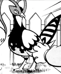 | Unfezant is the second of Bianca's father's Pokémon seen. He was borrowed by Bianca, Cheren, and Black to practice Pokémon battling.