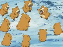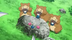 In The Clumsy Crier Quiets the Chaos!, a Pokémon Breeder's Bidoof was playing with a Teddiursa and a Linoone when they were all attacked by a rampaging Salamence. Teddiursa was then taken to a Pokémon Center and healed with the help of Nurse Joy and her Wigglytuff.
