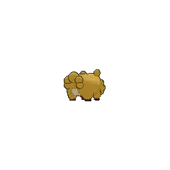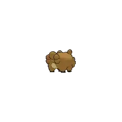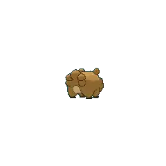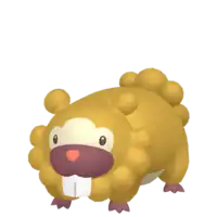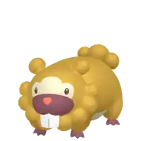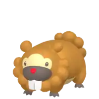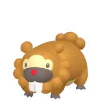 Bidoof is a brown, rodent-like Pokémon with four short legs. It has a short, dark brown snout and a small, red nose. Cream-colored markings cover its underside and surround its face. Round tufts of fur form its tail with five on the male and three on the female. Similar tufts line the bottom of its face and two singular ones form its ears. Bidoof's black paws have three toes with some webbing between them. Protruding from Bidoof's upper jaw are large incisors, which it uses for gnawing on wood and rocks. These teeth grow constantly, so this Pokémon needs to gnaw on hard substances to keep them ground down. This Pokémon can be found nesting in groups near bodies of water. Despite its stout body, this Pokémon can be agile and is not easily perturbed.