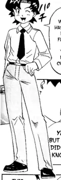 • In the English dub of the anime, his Kansai dialect is portrayed as a British English accent, while in the Pokémon Adventures manga, this becomes a southern American accent.