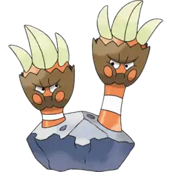 Binacle is a Pokémon that resembles a goose barnacle. It also has the appearance of a hand and arm; the “hand” serves as its head. Its head is brown with puffy orange cheeks and an orange marking where a nose would be located. On top of its head are three long claws. Its body is orange with a white band around the middle.