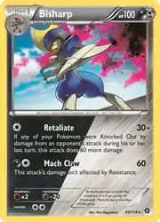 Bisharp (Japanese: キリキザン Kirikizan) is a dual-type Darkness/Metal Stage 1 Pokémon card. It is part of the Steam Siege expansion.