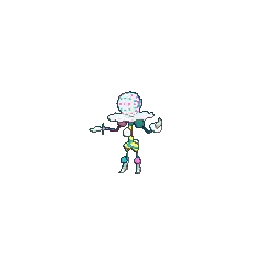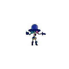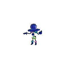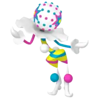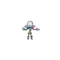 Blacephalon's head is a white ball with a multitude of pink and blue dots, which are a collection of tiny sparks. On either side of the ball are stars that are blue on the outside, pink on the inside, and have yellow dot-like eyes on the center. The head is not attached to the body and can be removed for use as a weapon. As seen in Pokémon Refresh, the color of the sparks and the color and shape of the stars change with Blacephalon's mood. As seen in the anime, this Ultra Beast can freely move its head around easily and regenerate after blowing it up. It is known to trick its targets through the silly way it walks before blowing its head up without warning. It then steals their vitality to use as energy.[1] Blacephalon is the only known Pokémon capable of learning the move Mind Blown.
