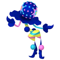 Blacephalon is a colorful, humanoid Ultra Beast. Its slender torso and wide hips are yellow with alternating blue and pink stripes. There is a white sphere in the middle of its body and another on its back in place of a tail. It has thin arms with white frills on its wrists and teardrop-shaped hands. The right arm is pink, while the left is blue. Each arm has a spherical bulge near the shoulder. Its legs are shaped like white high-heeled boots with curled toes. Each foot has a sphere on it: blue on the left and pink on the right. Around its neck is a white frill with a hole in the center.