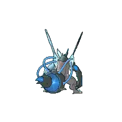The right side of its body seems to be damaged in some way, as the wing and horn on its head on that side are shorter; the right side of its head also has a spiked edge near its jaw hinge that is absent from its left. Its legs are somewhat slender and have three sharp ice-like claws on each enormous foot. Its tail has three blue conical spikes on its tip, and appears to be some sort of propulsion device or a container of energy; exactly what it is based on is unclear, but it may be a damaged turbine.