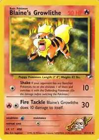 Blaine's Growlithe (Japanese: カツラのガーディ Katsura's Gardie) is a Fire-type Basic Pokémon card. It was first released as part of the Gym Heroes expansion.
