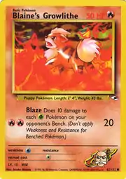 Blaine's Growlithe (Japanese: カツラのガーディ Katsura's Gardie) is a Fire-type Basic Pokémon card. It is part of the Gym Heroes expansion.
