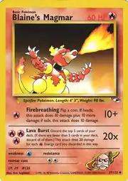 Blaine's Magmar (Japanese: カツラのブーバー Katsura's Boober) is a Fire-type Basic Pokémon card. It was first released as part of the Gym Heroes expansion.