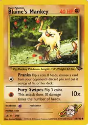 Blaine's Mankey (Japanese: カツラのマンキー Katsura's Mankey) is a Fighting-type Basic Pokémon card. It is part of the Gym Challenge expansion.