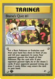 Blaine's Quiz #1 (Japanese: カツラのクイズ その1 Katsura's Quiz Number 1) is a Trainer card. It is part of the Gym Heroes expansion.