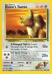Blaine's Tauros (Japanese: カツラのケンタロス Katsura's Kentauros) is a Colorless-type Basic Pokémon card. It is part of the Gym Heroes expansion.