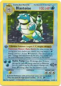 Blastoise (Japanese: カメックス Kamex) is a Water-type Stage 2 Pokémon card. It was first released as part of the Base Set.